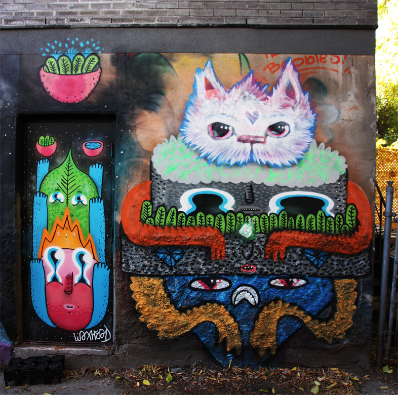 waxhead-cryote-slcf1610 2016/10/15 806 × 800 Waxhead Waxhead (door, bottom right) and Cryote (top right) in a Mile End alley.