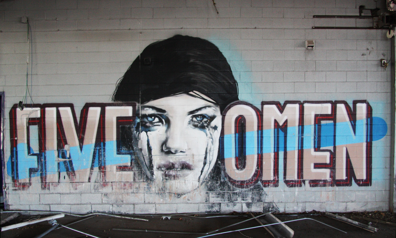 Omen (image) and Five Eight (text) in abandoned building