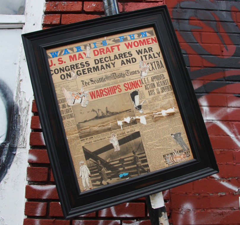 new1408-unknown3 2014/08/20 855 × 800 New street art and graffiti July-August 2014 unknown artist, framed newspaper cutting with stickers, Marie-Anne circa St-Laurent