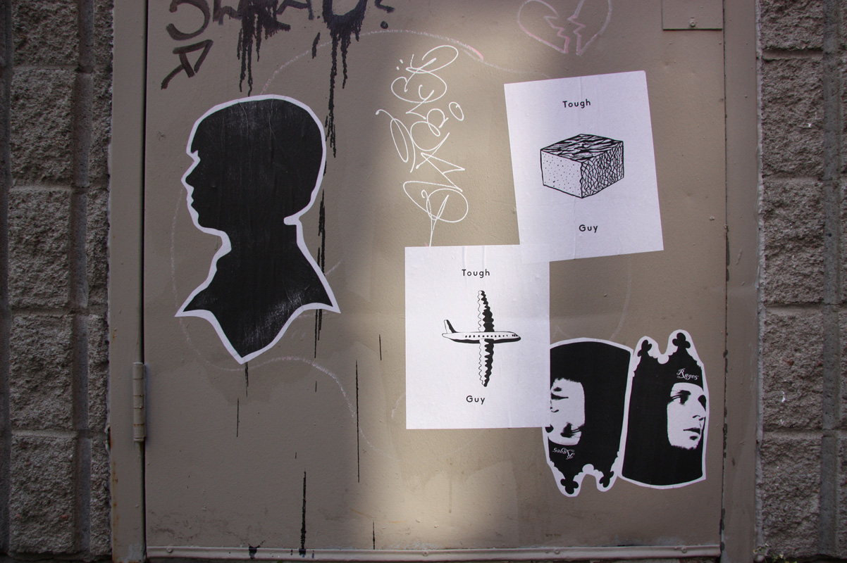 sdd17 2014/09/18 1202 × 800 St-Denis|Drolet back alley between Duluth and Roy various paste-ups by Rage5 (2 bottom right), unidentified (left), and Tough Guy (centre)
