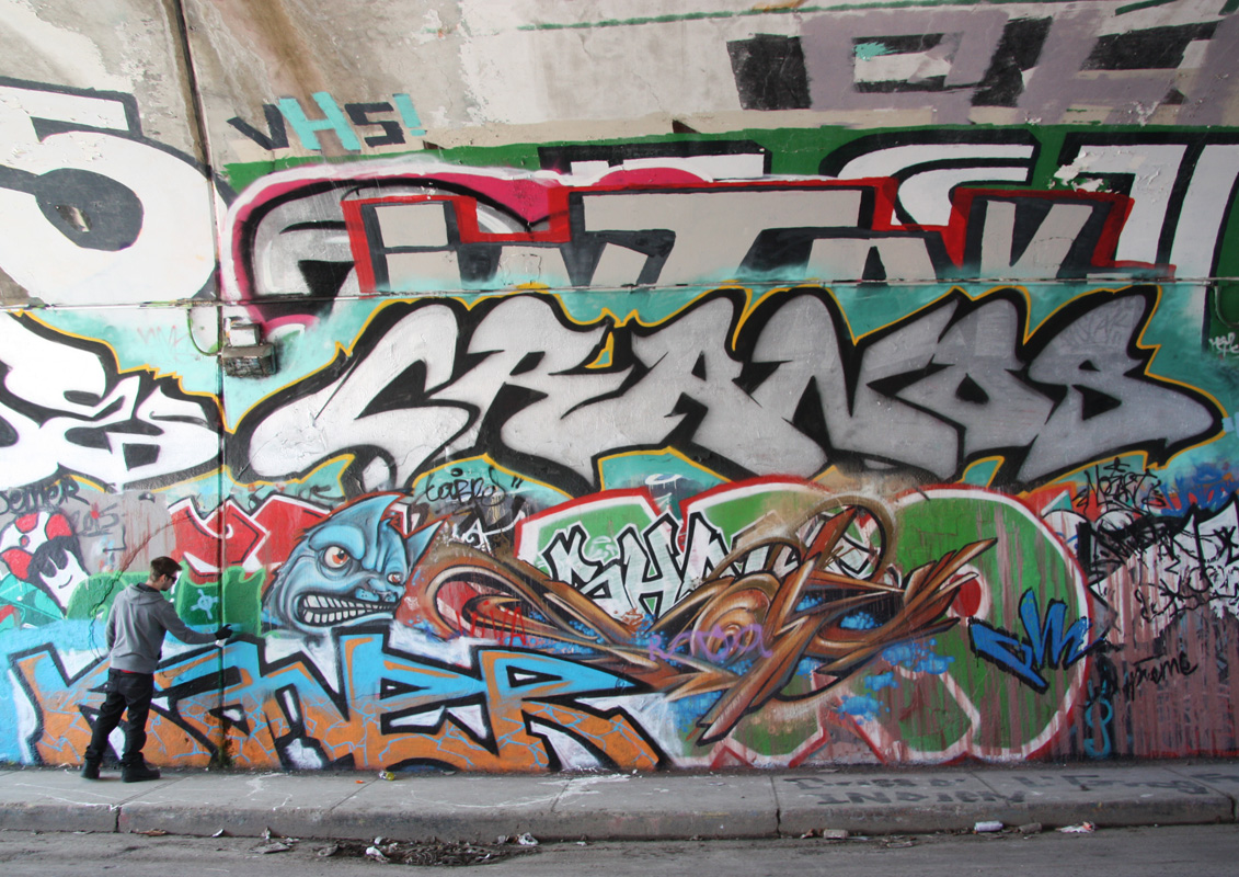 rouen-nm6e 2015/04/14 1131 × 800 De Rouen legal graffiti tunnel Kaner (work in progress bottom left), Skope (bottom right), Crane (middle), at the Rouen tunnel legal graffiti wall