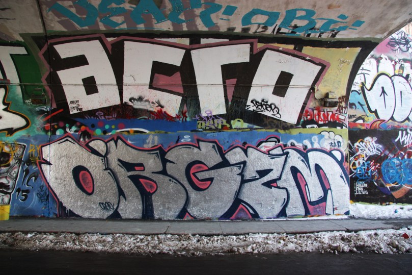 rouen-nm9d 2015/03/26 1202 × 800 De Rouen legal graffiti tunnel Orgzm (bottom), Acro (top) at the Rouen tunnel legal graffiti wall