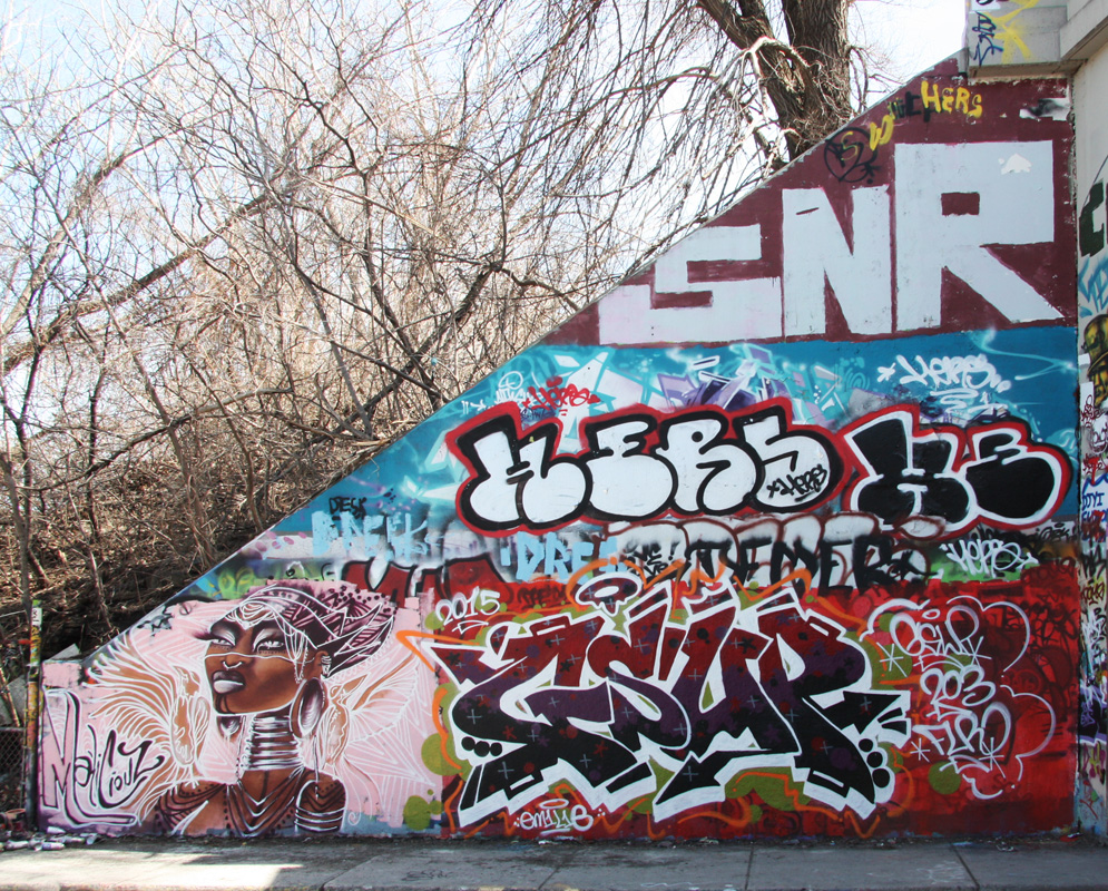 rouen-sl6 2015/04/14 995 × 800 De Rouen legal graffiti tunnel Maliciouz (bottom left), Gsup (bottom right), Hers (middle), Saner (top) at the Rouen tunnel legal graffiti wall