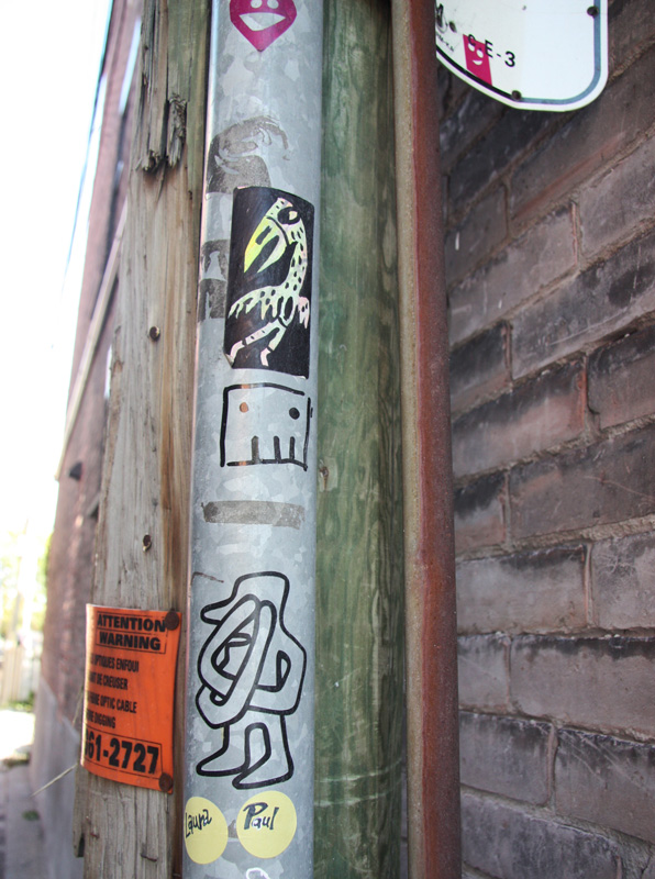 slcf-unknowns 2015/02/27 596 × 800 St-Laurent|Clark back alley between Laurier and St-Viateur Stickers by various unknown artists in alley between St-Laurent and Clark