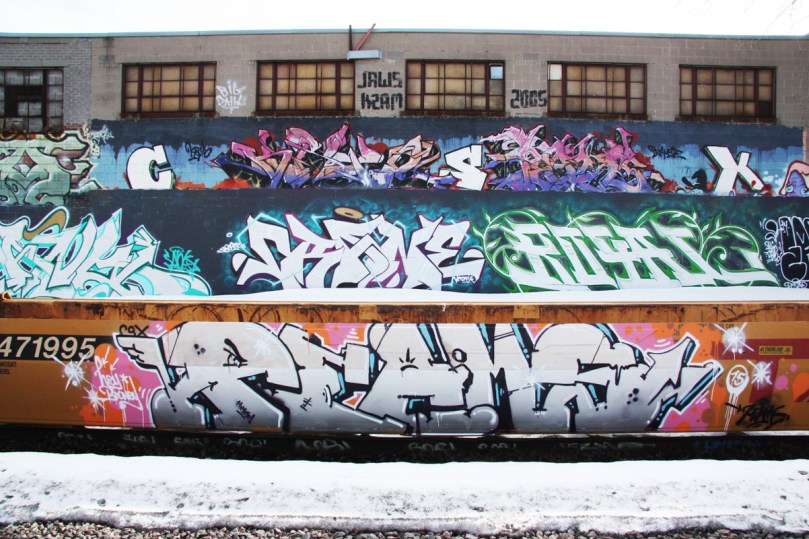 new1503-tracks-peams-csx 2015/04/02 1202 × 800 New street art and graffiti February-March 2015 Graffiti by Peams-CSX on parked train. Also visible on the background wall is graffiti by Crane, Royal and many others.