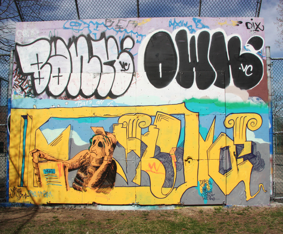 new1503-mshl 2015/05/06 968 × 800 New street art and graffiti Spring 2015 Painted piece by MSHL (bottom), plus throws at the top by Bank and Owk