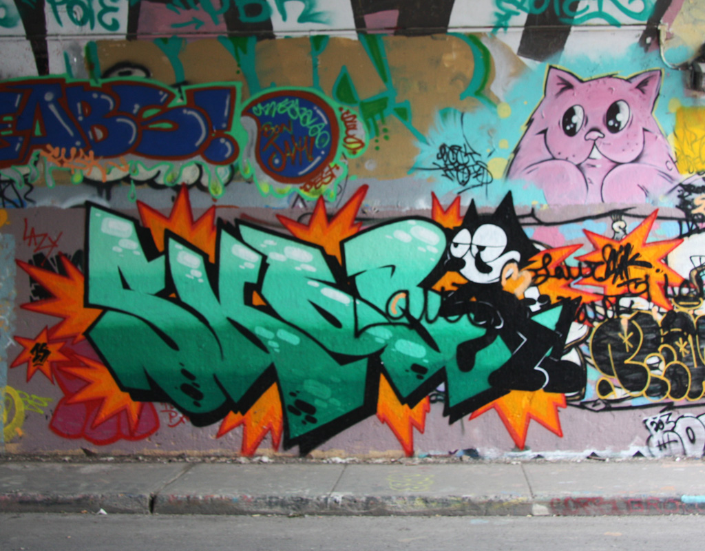rouen1506-skor-mrchose 2015/06/22 1024 × 800 New graffiti May-June 2015 Skor (bottom) and Mr Chose (pink cat) at Rouen tunnel