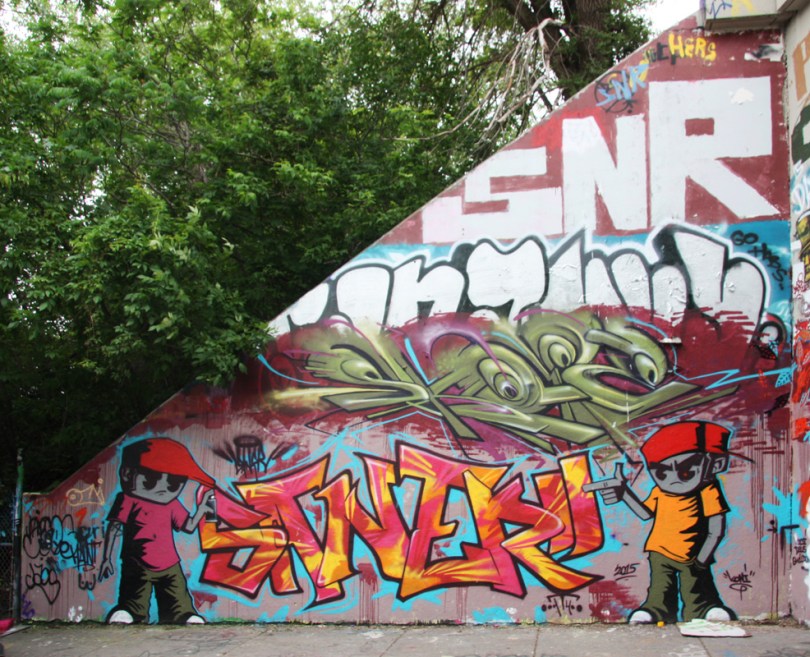 rouen1506-skope-saner 2015/06/22 986 × 800 New graffiti May-June 2015 Pieces by Saner (top), Skope (middle), Saner (bottom letters) and Koni (bottom characters) at Rouen tunnel