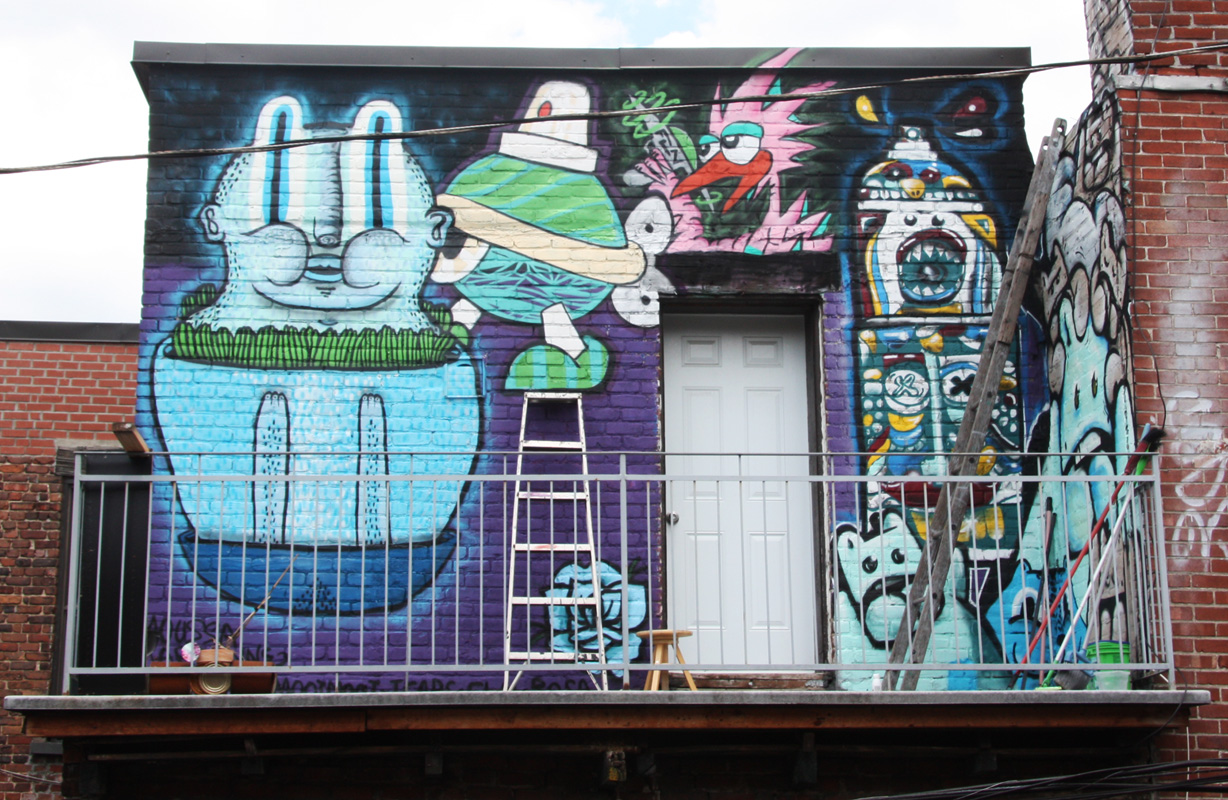 new1506-waxhead-turtlecaps-fln-elmootmoot 2015/06/23 1228 × 800 New painted works May-June 2015 Collective work featuring Waxhead (left and bottom corner), Turtle Caps (above ladder), Futur Lasor Now (above door), Deadliest Rosa (flower) and El Moot Moot (right wall)
