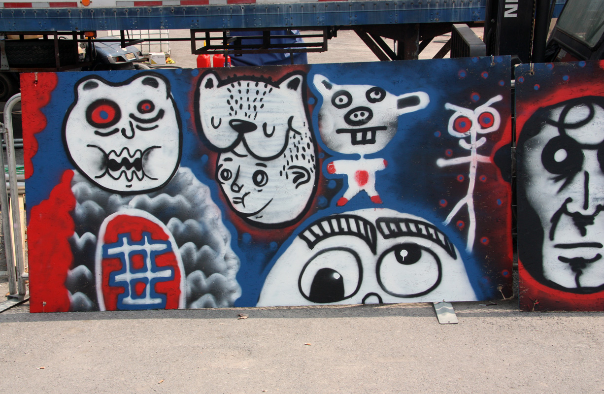 new1507-waxhead-q 2015/07/23 1226 × 800 New street art June-July 2015 part 2 The second character from the left is by Waxhead. This panel was part of a workshop with kids.
