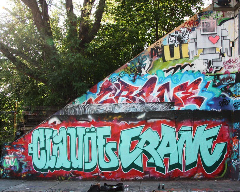 rouen1508-cc 2015/08/22 998 × 800 New graffiti August 2015 Claude Le Fermier and Crane (bottom), a Lovebot wheatpaste (top) at the Rouen tunnel legal graffiti walls