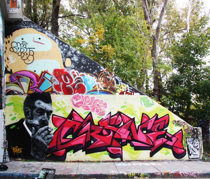 rouen1510-rouks-crane 2015/10/17 934 × 800 New graffiti October 2015 Rouks (left) and Crane (right) at the October 2015 Rouen jam; top character by Waxhead; flops by Rokos (black outline) and Penar (red)