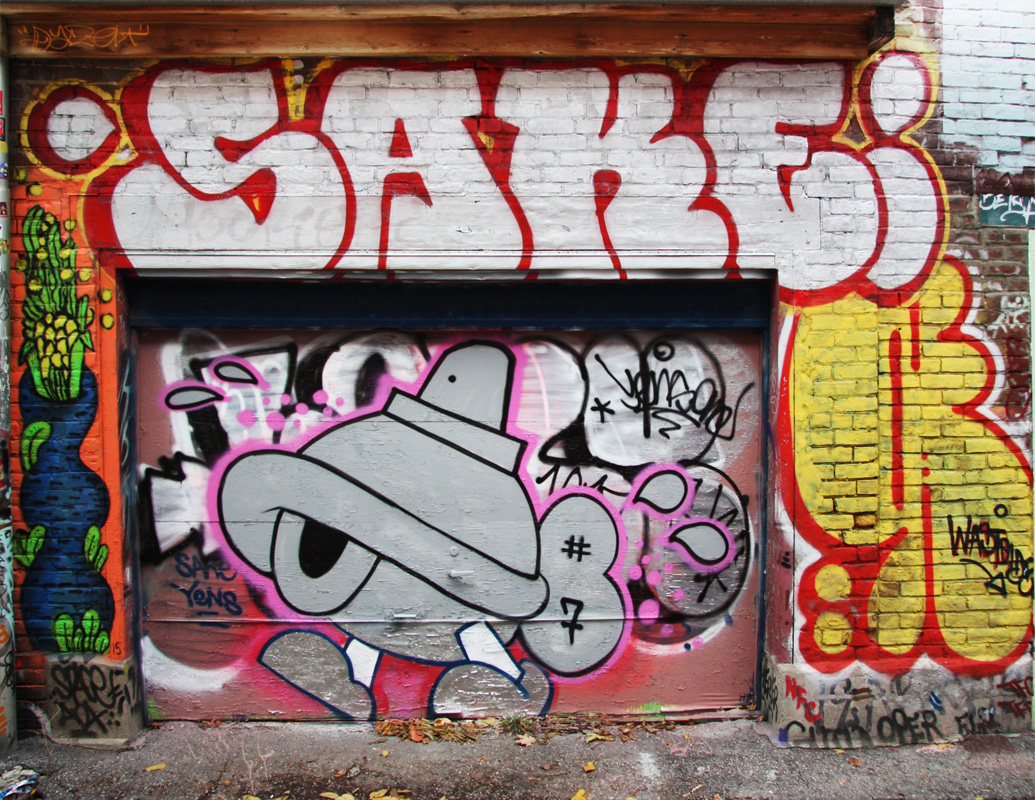 new1510-turtlecaps7 2015/11/03 1035 × 800 New murals and other painted works October 2015 Turtle Caps (on door), Sake throwie at the top, Waxhead on the left, Wastoids on the right, in Plateau End alley
