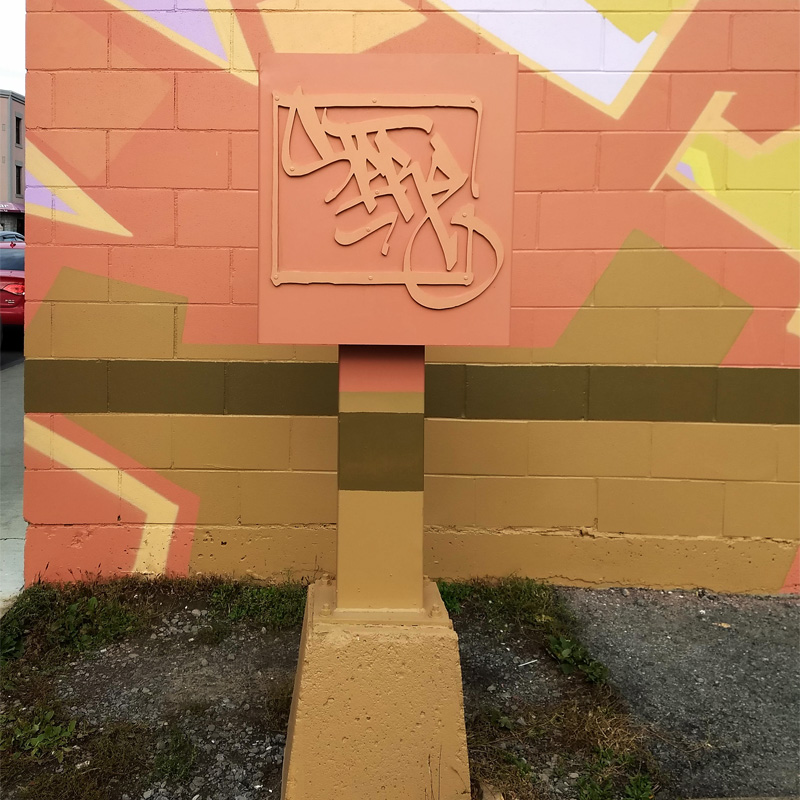stare-hochelaga1910d 2019/11/02 800 × 800 Stare close-up on a signature installation in front of a mural diptych by Stare in Hochelaga