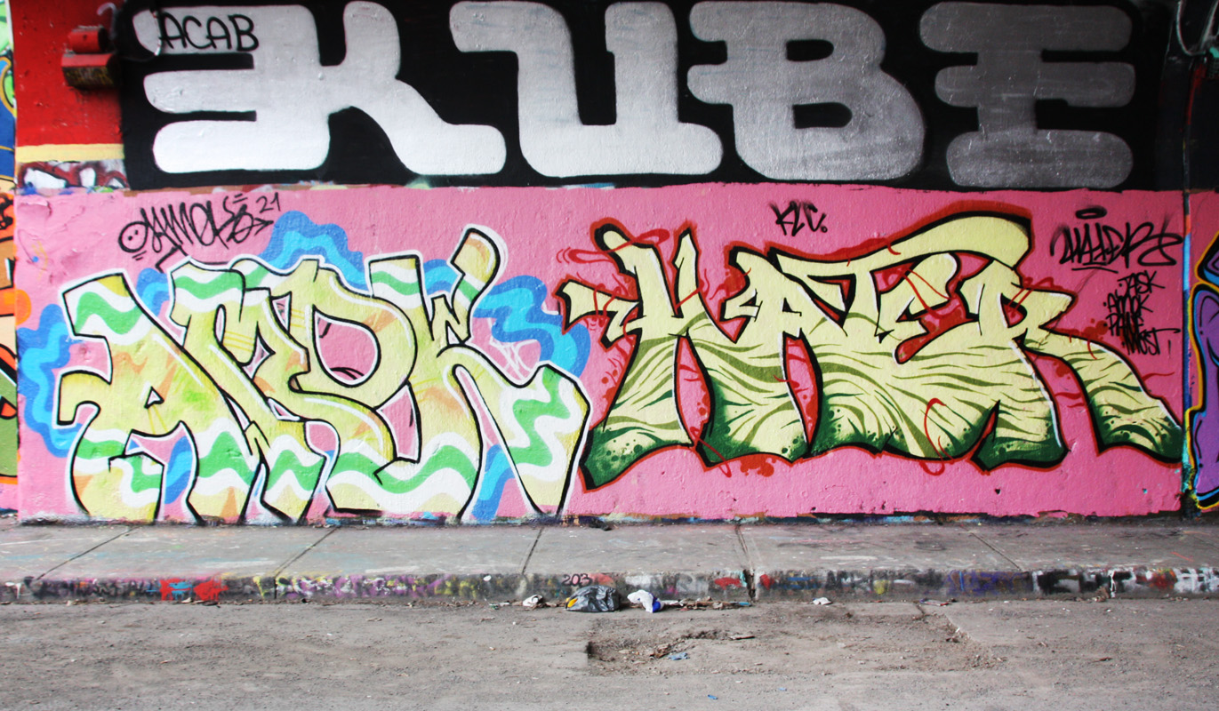 rouen1604-amok-hater 2016/05/04 1371 × 800 New graffiti April 2016 Amok (left), Hater (right) and Kube (above) at the Rouen legal graffiti tunnel