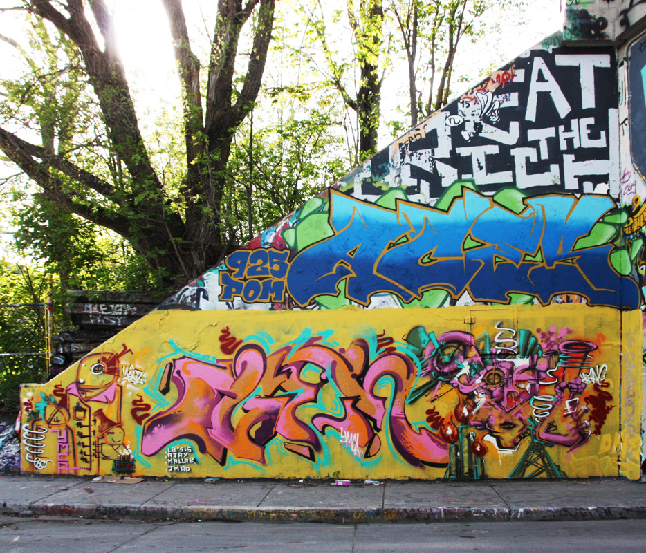 rouen1605-max-ogen1b 2016/05/19 934 × 800 New graffiti May 2016 Max and Ogen (ground level) and Aces (above) at the Rouen legal graffiti tunnel