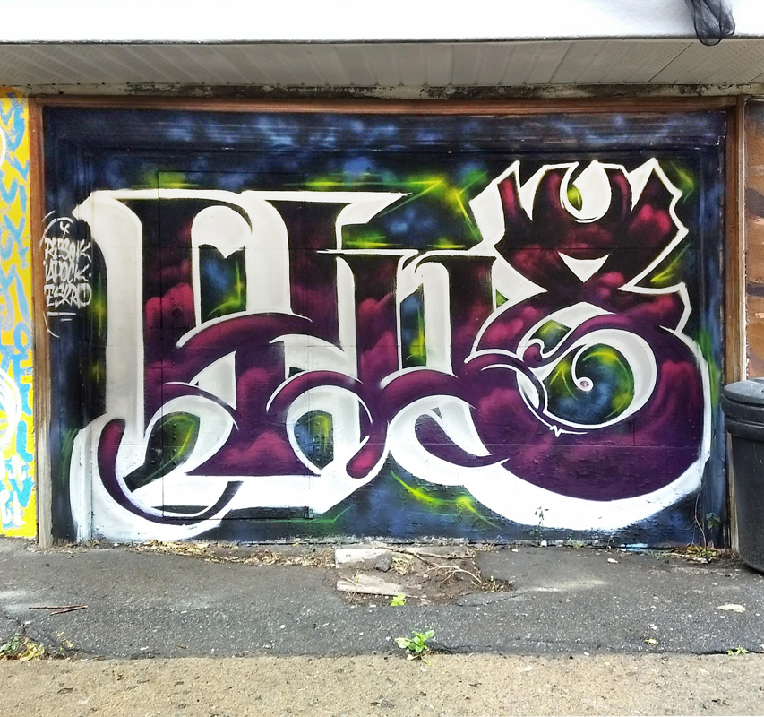 yu8-canettes1809 2018/11/21 853 × 800 Eskro Eskro and Resok doing the name of their crew YU8 on a garage door for the Canettes de Ruelle production