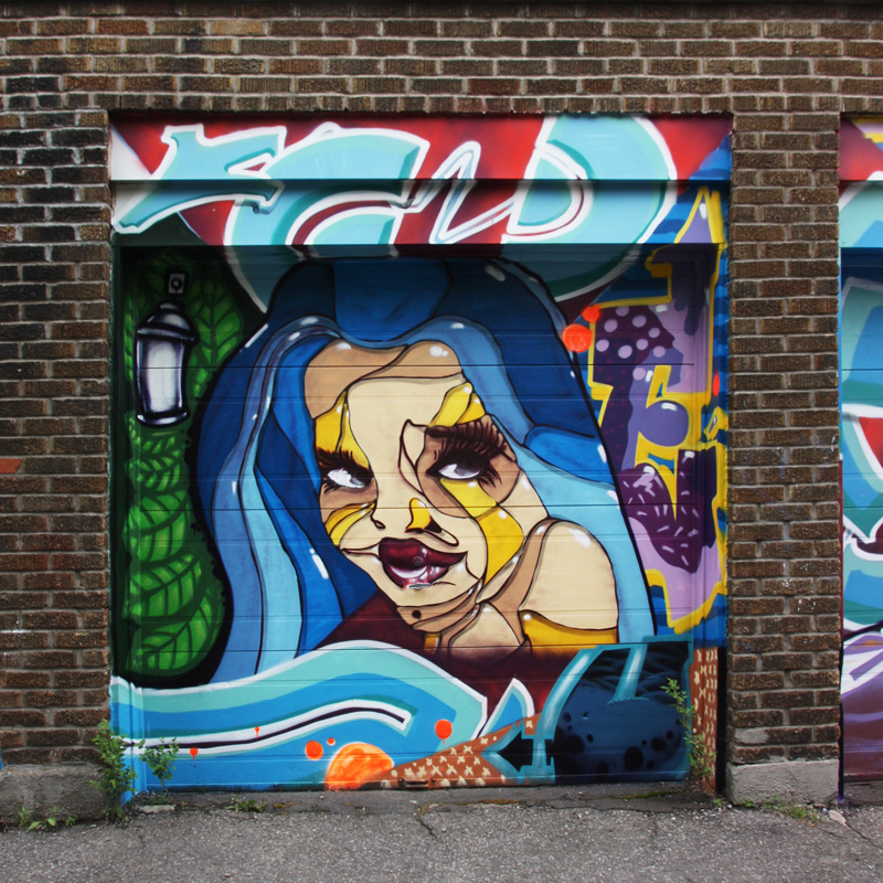 ofusk-gaulois-bopor-fafard1706d 2023/01/28 800 × 800 Ofusk Collaboration of Fokus aka Ofusk, Gaulois and Bopor over 4 garage doors in a Hochelaga alley (detail)