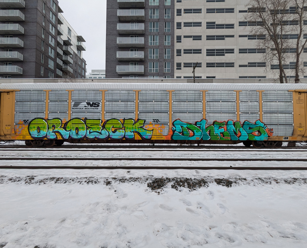 oroeck-dems-trackcdn2512 2025/12/31 989 × 800 Retrospective of 2025 graffiti Oroeck and Dems on parked autorack