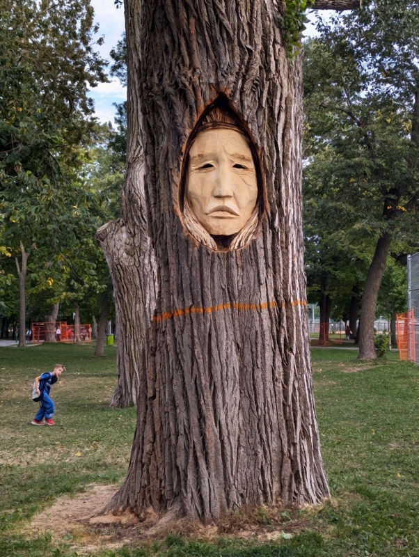 lucasbessedicaire-parclafontaine2509a 2025/12/27 602 × 800 Retrospective of 2025 murals and other painted street art Lucas Besse Dicaire relief sculpture on a tall tree stump in Parc Lafontaine