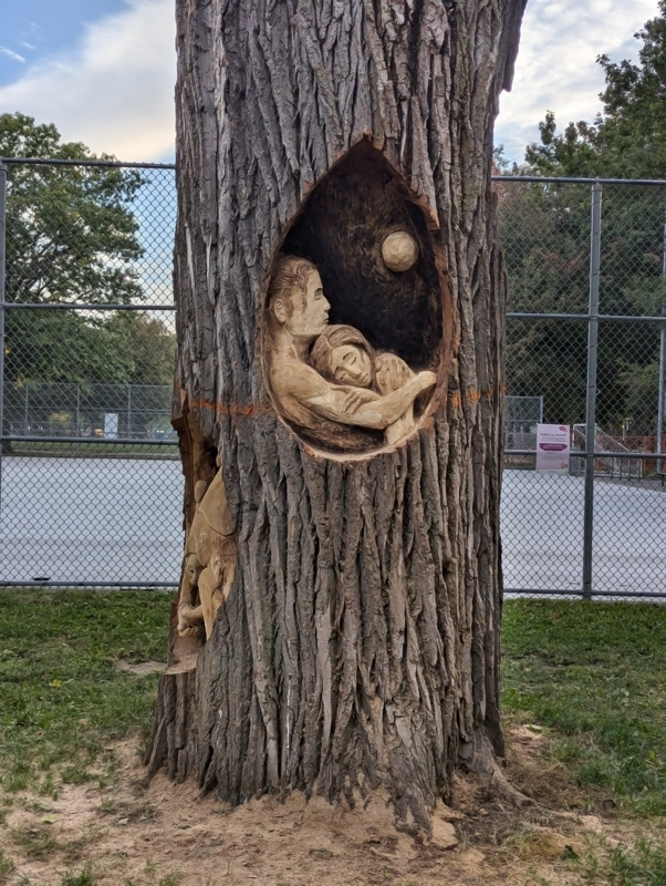 lucasbessedicaire-parclafontaine2509b 2025/12/27 602 × 800 Retrospective of 2025 murals and other painted street art Lucas Besse Dicaire relief sculpture on a tall tree stump in Parc Lafontaine